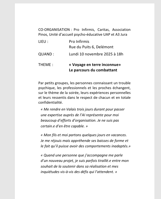 CO-ORGANISATION : Pro Infirmis, Caritas, Association Pinos, Unité d’accueil psycho-éducative UAP et A3 Jura